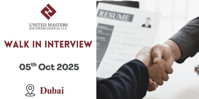 Are you in search of exciting career opportunities in UAE? United Masters Electromechanical LLC has announced its latest Walk in Interview. They are looking for talented and passionate individuals to join their team. Attend the Interview with your latest CV. Read on to discover more about this exciting Job vacancies and details.